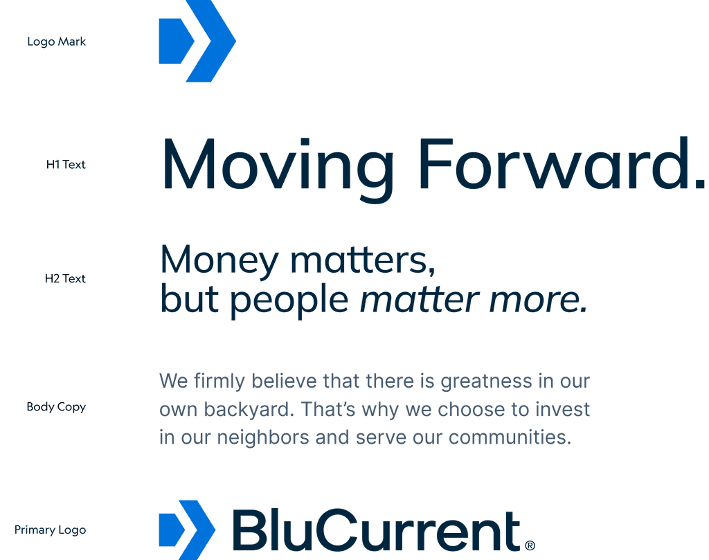 Every great brand has a story to tell, and BluCurrent's began in 1929. Moving away from the typical visual clichés of financial institutions, we crafted a bespoke identity system that blends the company’s rich history with a commitment to prioritizing people over profits. This approach sets BluCurrent apart in a crowded local market filled with impersonal institutions, enhancing real connections with their members.